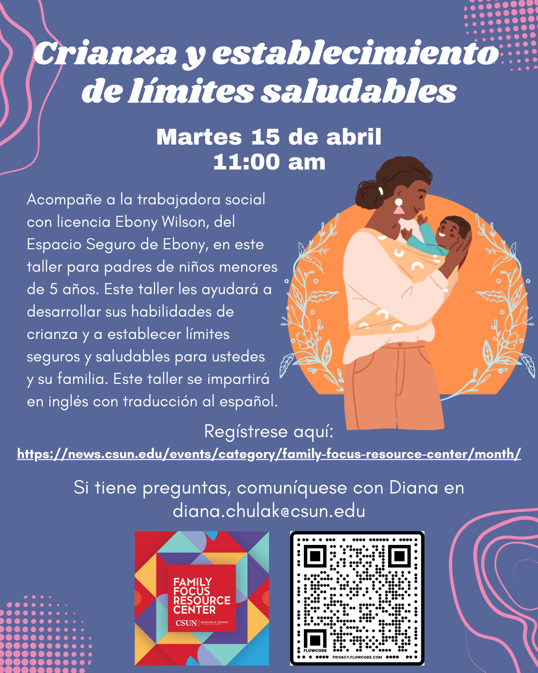 Join LCSW Ebony Wilson from Ebony’s Safe Space for this workshop for parents of children under age 5 that will help nurture your parenting skills and create safe and healthy boundaries for you and your family. This workshop will be presented in English with Spanish translation available.