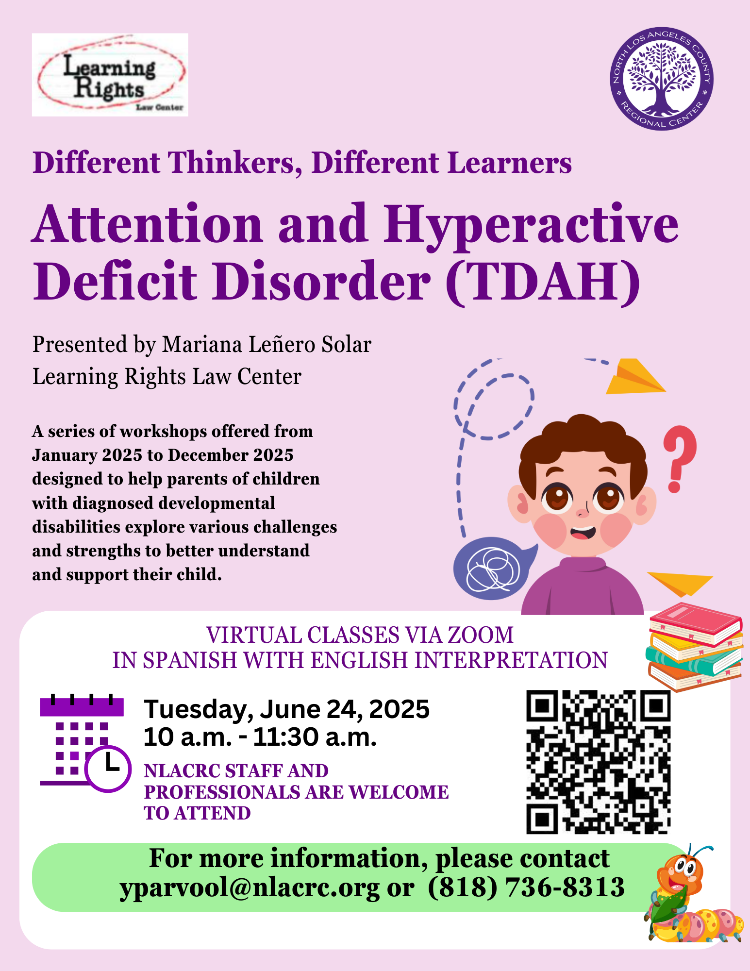 “Diferentes maneras de pensar, Diferentes maneras de aprender” es una oportunidad para que usted aprenda y comprenda mejor las diferentes habilidades de su hijo. Tendrá acceso a ideas y herramientas para ayudar a su hijo con sus habilidades de aprendizaje. Mariana Leñero Solar es la instructora de la serie. La Sra. Leñero Solar es consultora psicoeducativa e instructora del programa de autodefensa TIGER de LRLC diseñado y enseñado por Learning Rights para fomentar las herramientas de las familias que necesitan abogar con éxito dentro de la educación especial.