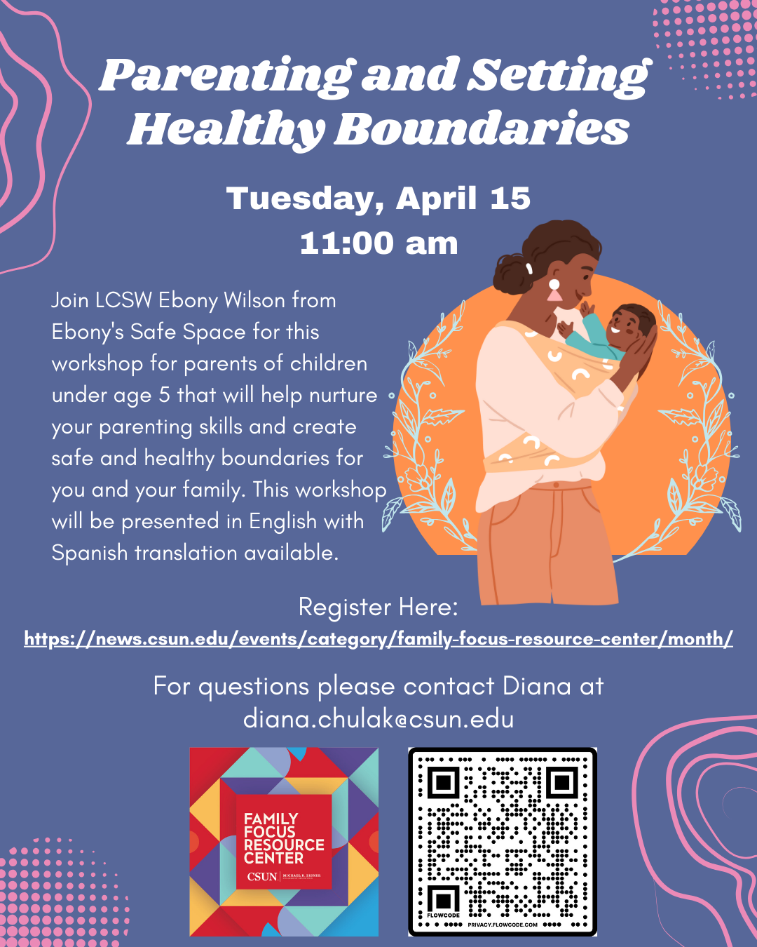 Join LCSW Ebony Wilson from Ebony’s Safe Space for this workshop for parents of children under age 5 that will help nurture your parenting skills and create safe and healthy boundaries for you and your family. This workshop will be presented in English with Spanish translation available.