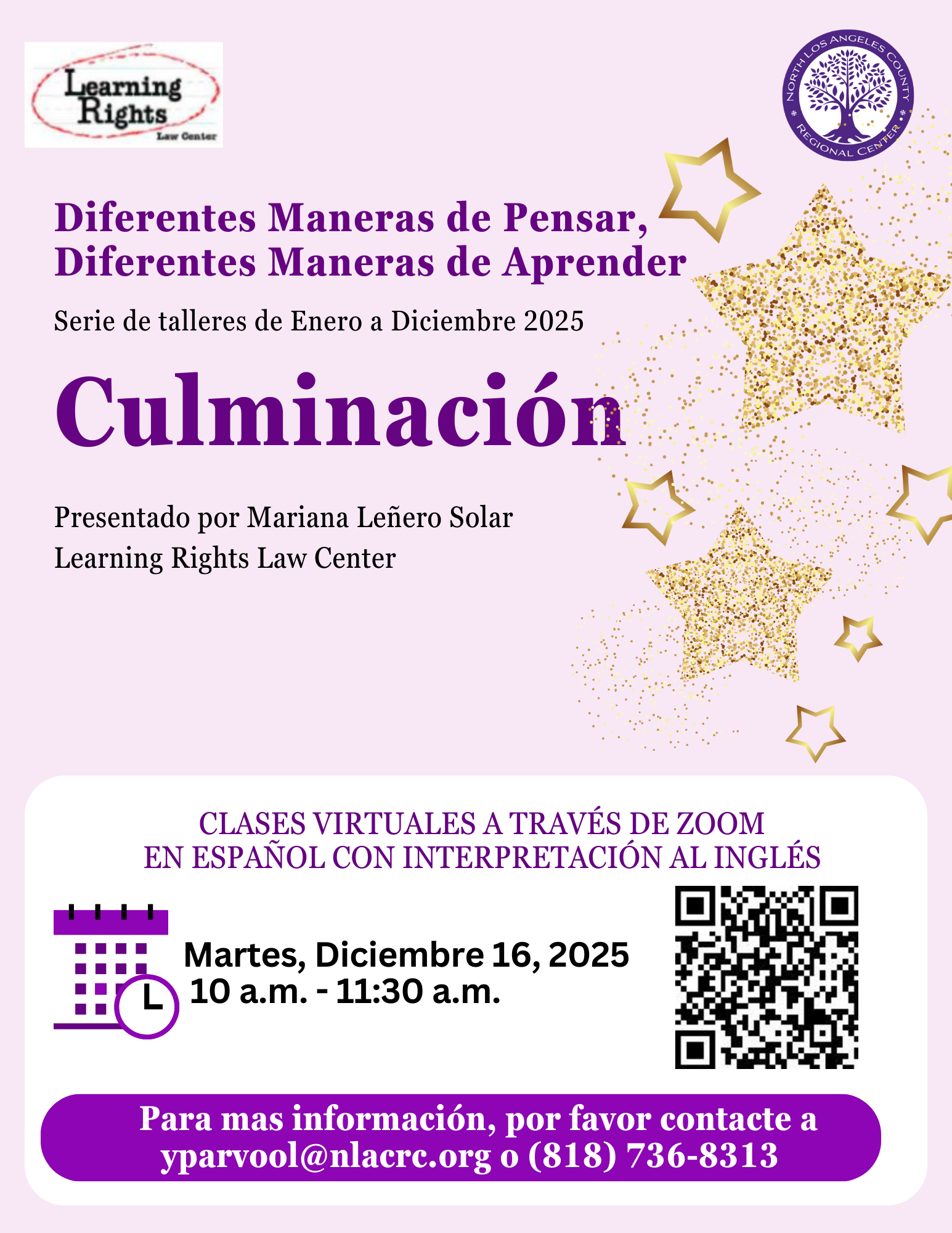 “Diferentes maneras de pensar, Diferentes maneras de aprender” es una oportunidad para que usted aprenda y comprenda mejor las diferentes habilidades de su hijo. Tendrá acceso a ideas y herramientas para ayudar a su hijo con sus habilidades de aprendizaje. Mariana Leñero Solar es la instructora de la serie. La Sra. Leñero Solar es consultora psicoeducativa e instructora del programa de autodefensa TIGER de LRLC diseñado y enseñado por Learning Rights para fomentar las herramientas de las familias que necesitan abogar con éxito dentro de la educación especial.
