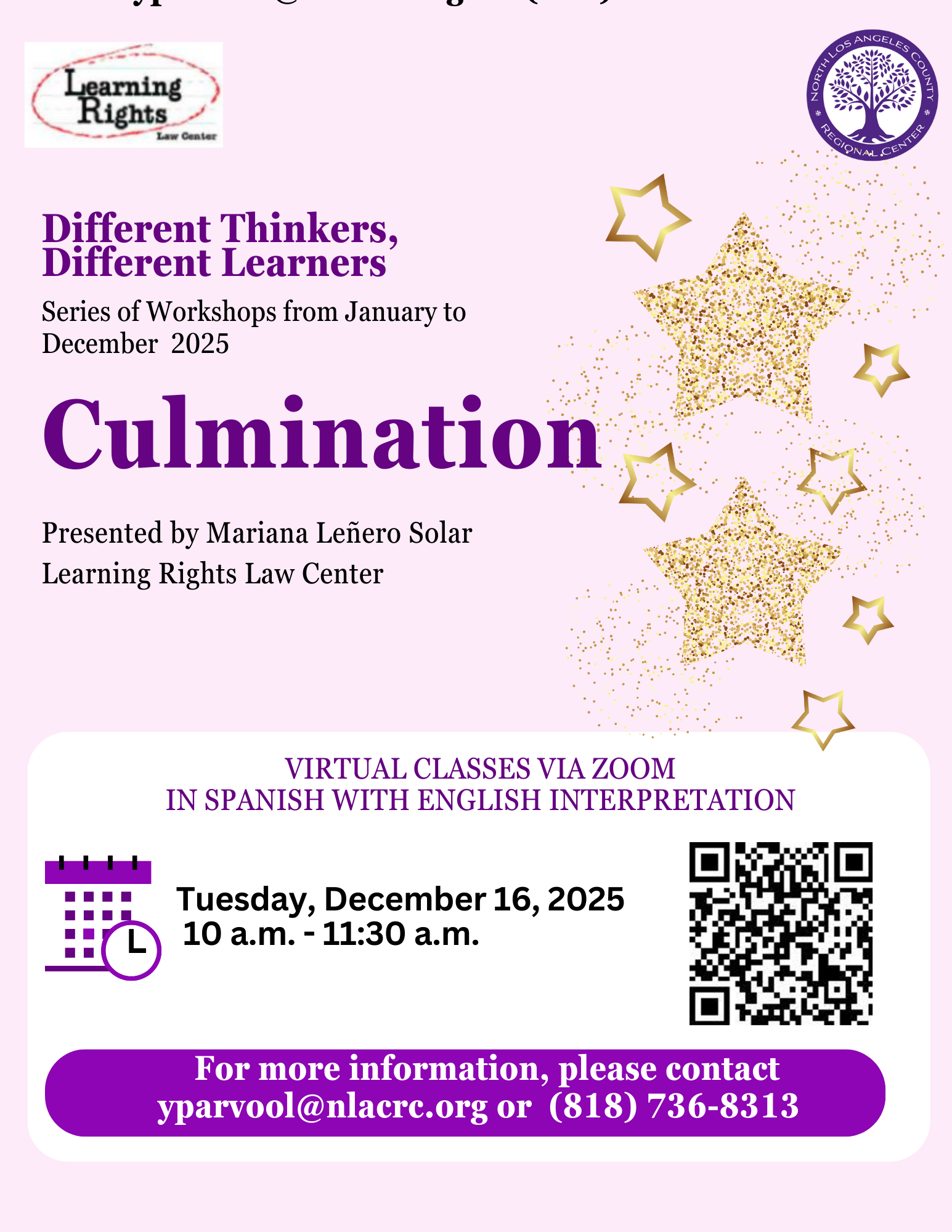 “Diferentes maneras de pensar, Diferentes maneras de aprender” es una oportunidad para que usted aprenda y comprenda mejor las diferentes habilidades de su hijo. Tendrá acceso a ideas y herramientas para ayudar a su hijo con sus habilidades de aprendizaje. Mariana Leñero Solar es la instructora de la serie. La Sra. Leñero Solar es consultora psicoeducativa e instructora del programa de autodefensa TIGER de LRLC diseñado y enseñado por Learning Rights para fomentar las herramientas de las familias que necesitan abogar con éxito dentro de la educación especial.